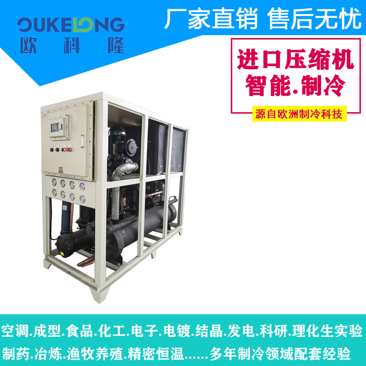 歐科隆40匹Ex防爆水冷箱式冷水機組是一款通過國家防爆認(rèn)證(Ex dⅡB T4 Gb)的專業(yè)工業(yè)制冷設(shè)備,制冷量140kW,專為石油、化工、制藥等易燃易爆環(huán)境設(shè)計。機組采用正壓防爆箱體結(jié)構(gòu),關(guān)鍵防爆部件均符合ATEX標(biāo)準(zhǔn)。